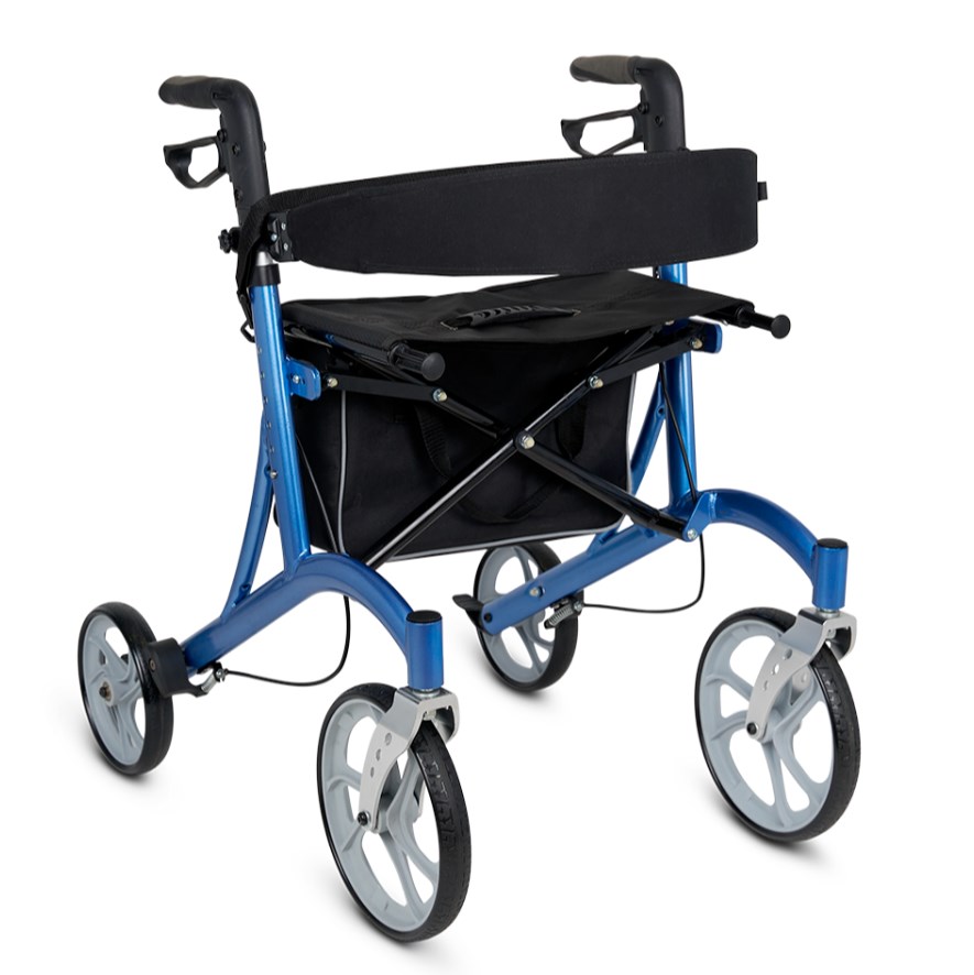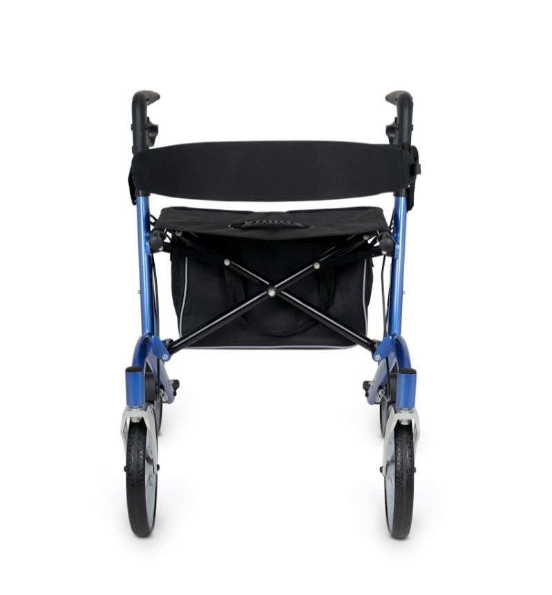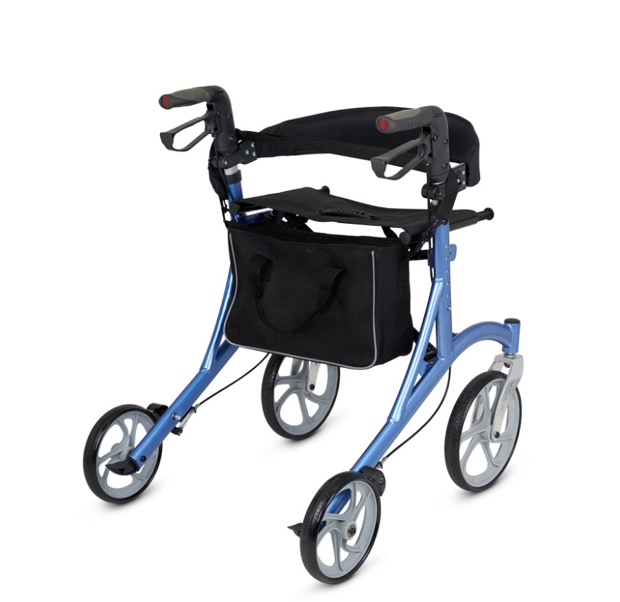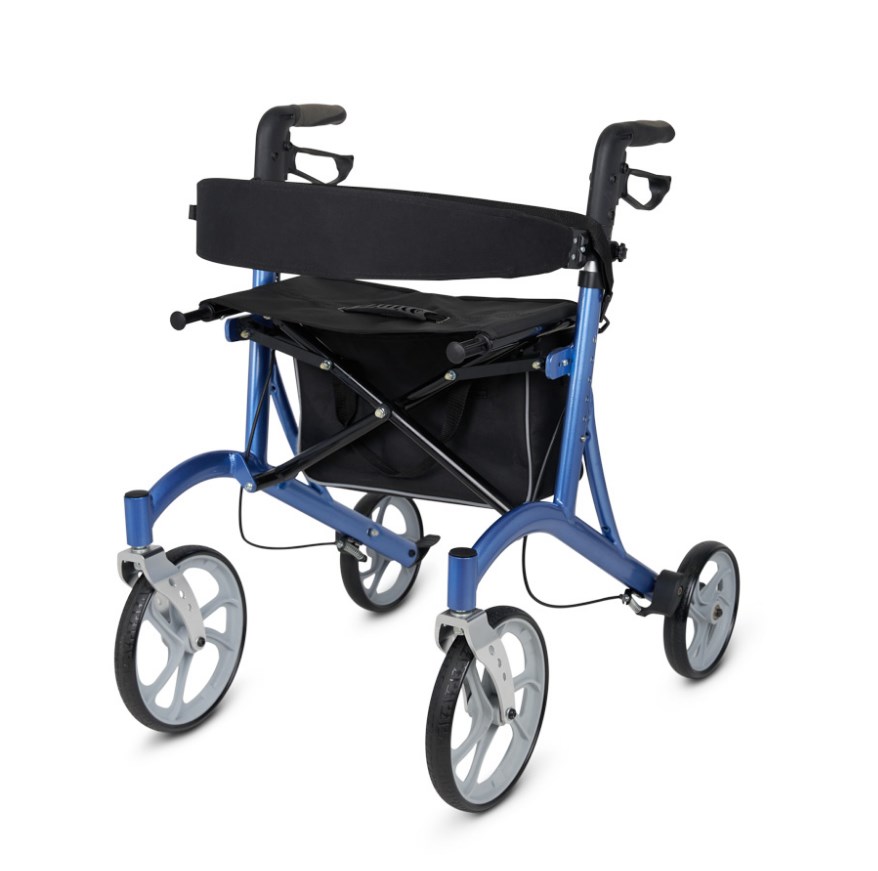 Для контроля движения используются удобные ручные тормоза, расположенные под ручками, — они позволяют ненадолго притормозить ходунки. На время полной остановки и отдыха колёса фиксируются неподвижно — для этого достаточно опустить рычаги тормозов вниз.
