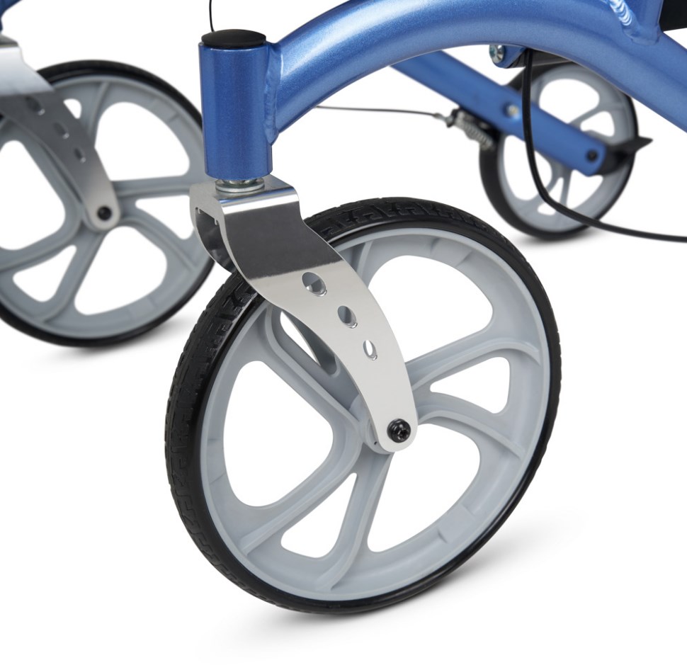 Прочные литые колёса позволяют катить ходунки перед собой, не поднимая их. Это снижает нагрузку на руки, ноги и позвоночник. Диаметр передних колёс больше, чем у задних, — это ускоряет движение и повышает манёвренность ходунков, облегчая повороты.