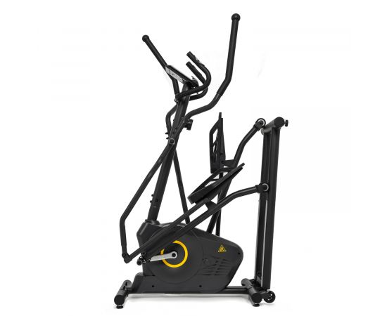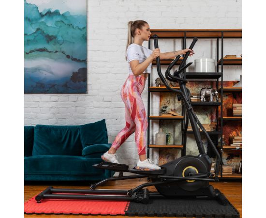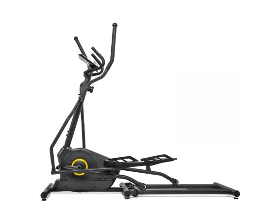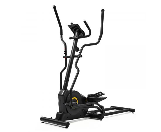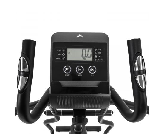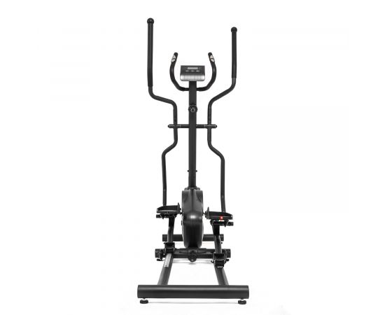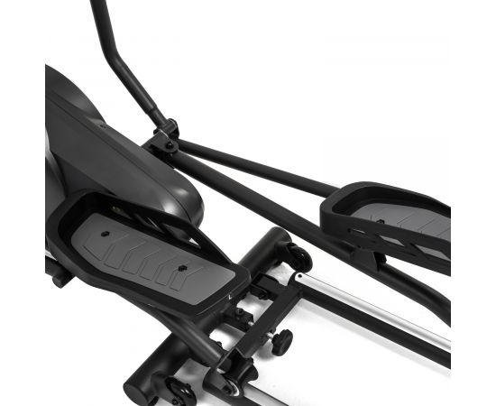 В этой модели эллиптического тренажёра есть всё для комфортных и результативных тренировок. На передней консоли можно удобно разместить планшет. Там же расположен дисплей, где отображаются основные параметры тренировки: скорость, дистанция, количество потраченных калорий, уровень пульса. Пульс считывается при помощи датчиков, расположенных на поручнях.