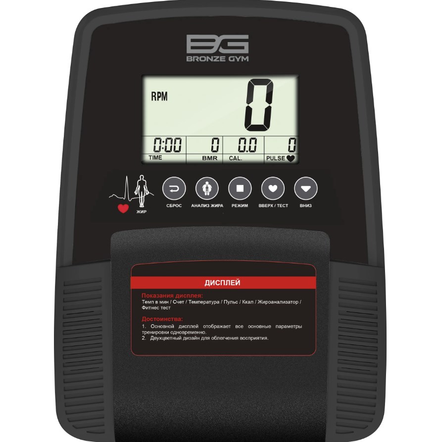 Тренировочный компьютер представлен многофункциональным LCD-дисплеем, отображающий 5 параметров одновременно. На экран компьютера выводятся все основные данные – время, счет, дистанция, пульс, темп/мин, фитнес тест, жироанализатор, метаболические индексы (BMI, BMR), температура в помещении.