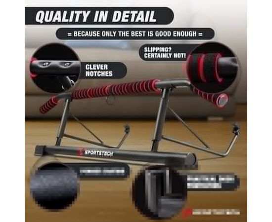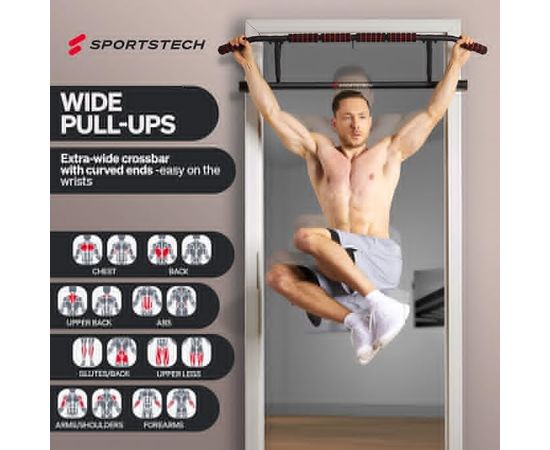 Модель рассчитана на максимальный вес пользователя 130 кг. Конструкция выполнена из прочной высокоуглеродистой стали с элементами из пены и полипропилена, что обеспечивает долговечность и комфорт при регулярных тренировках. Турник оснащён широкой перекладиной с наклонными концами ручек, которые повышают эргономичность, снижают нагрузку на суставы и делают занятия более безопасными и естественными.