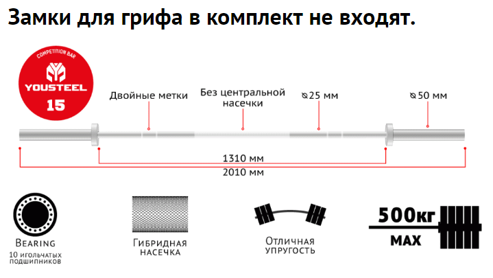 Каждый гриф проходит статический тест с нагрузкой 900кг, после чего проверяется его ровность. Поэтому мы с уверенностью даем пожизненную гарантию на деформацию рукояти.