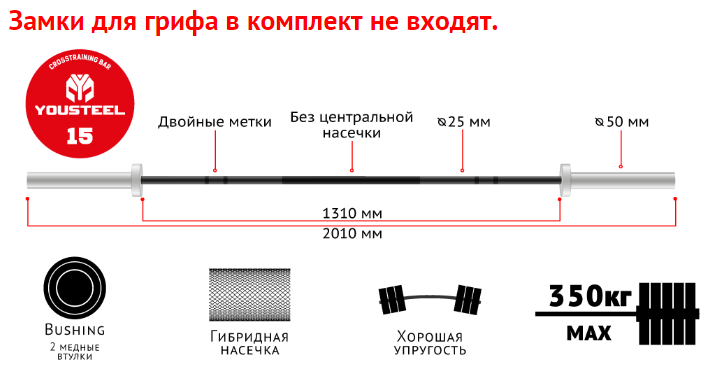 Рукоять грифа покрыта черным цинком для защиты от коррозии. При этом не стоит забывать, что снаряд нуждается в регулярной очистке от магнезии. Магнезия с потом в состоянии прожечь покрытие и испортить ваш гриф.
