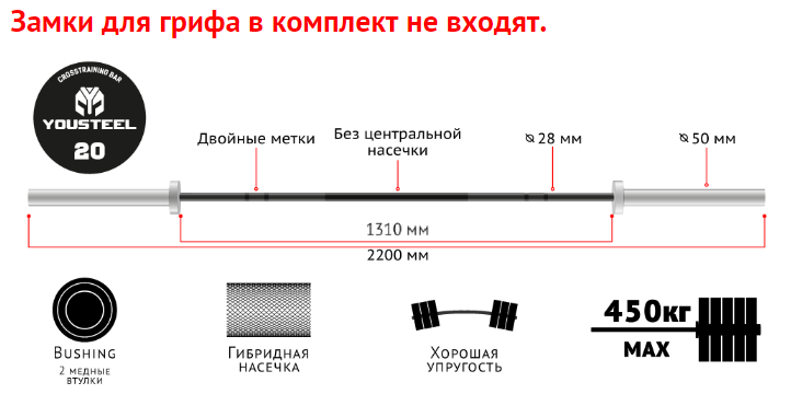 Рукоять грифа покрыта черным цинком для защиты от коррозии. При этом не стоит забывать, что снаряд нуждается в регулярной очистке от магнезии. Магнезия с потом в состоянии прожечь покрытие и испортить ваш гриф.